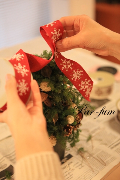 Par-fum尾崎です。来月上旬まではクリスマスレッスンが続きます。土台の大きさやボリューム、オーナメントの位置、そしてリボンも悩みます。オリジナルツリーやリース、生徒さん達はじっくり考えて決めます。リボンの色1つでもイメージが変わりますね。今年も3種類新しいリボンをご用意しました。