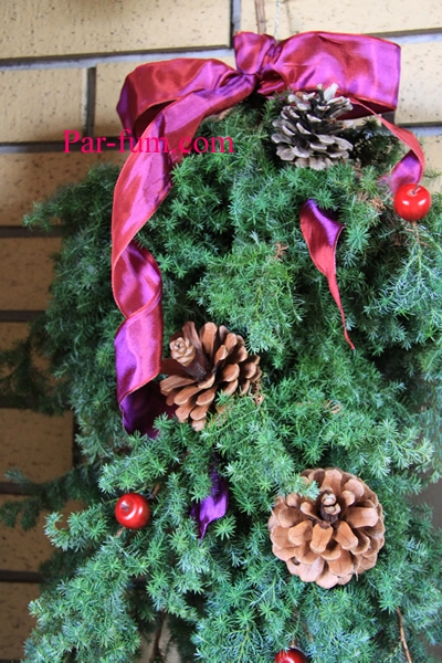 私は簡単リースは玄関外に飾り、お気に入りのオーナメント