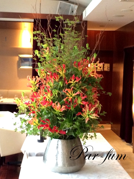 私はレストランの生け込みをしておりましたが、広さを考えて中心になるお花がどこからでも見え季節を感じていただけるようにほぼ毎回枝物を使っていました。高さも出せて、季節感もだせる、そして枝物はとても長く楽しめるのでレストランなどではとても向いています。