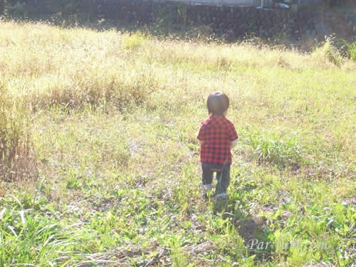 甥は草むらを走り、時期はずれのタンポポの綿毛をとって