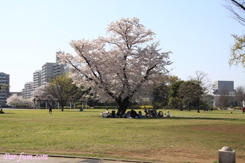 公園の中心にある大きな桜の木の下で、みなさん楽しそうに
